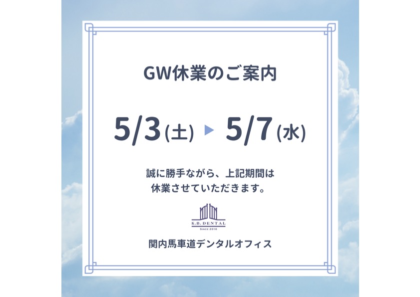 TOPページお知らせ5月3日〜7日までのゴールデンウィーク期間は休診とさせていただきます。 2025年05月02日 5月3日〜7日までのゴールデンウィーク期間は休診とさせていただきます。 ご迷惑をおかけしますが、ご理解ご協力のほど宜しくお願い申し上げます。 « 3月16日〜20日まで休診とさせていただきます。 7月1日(火)〜配信 1Dオンラインセミナー『診療報酬1,700点、保険医の武器になるスキル。』 〜GPのための骨隆起形成術 適応症例から術式、器材と手技の注意点と解説〜で講師を務めます。 » カテゴリー お知らせ (64) 活動報告 (108) 院内コラム・ブログ (22) 最近の投稿 8月10日〜17日まで夏期休診とさせていただきます。 第29回WCOI(国際口腔インプラント会議・日本部会)年次学術大会・総会にて座長を務めました。 6月30日月曜日は特別診療日のため休診となります。 6月26日(木)は幼稚園検診のため16時から診療となります。 7月7日(月)〜配信 1Dオンラインセミナー『GPのための過剰歯抜歯』〜 診査診断、介入の判断から小手術のテクニックを解説〜で講師を務めます。 7月7日(月)〜配信 1Dオンラインセミナー『埋まった親知らず、ハマり知らず。』〜 智歯・過剰歯・埋伏犬歯などあらゆる“埋伏歯”抜歯のための解剖・診断とテクニック〜で講師を務めます。 7月1日(火)〜配信 1Dオンラインセミナー『診療報酬1,700点、保険医の武器になるスキル。』 〜GPのための骨隆起形成術 適応症例から術式、器材と手技の注意点と解説〜で講師を務めます。 ご予約・お問合せ 初めての方でもお気軽にお問合せ・ご相談下さい 平日 10:00-14:00 / 16:00-20:00 土曜 11:00-14:00 / 16:00-19:00水曜・日曜・祝日:休診 診療予約 カウンセリング予約 無料メール相談 〒231-0015 神奈川県横浜市中区尾上町5丁目68 馬車道RAビル 2F 電車 地下鉄ブルーライン「関内」駅 7番出口 徒歩 30 秒 JR京浜東北線・根岸線「関内」駅 徒歩 2 分 東急東横線・みなとみらい線「馬車道」駅 5番出口 徒歩 5 分 JR京浜東北線・根岸線「桜木町」駅 徒歩 8 分 関内馬車道デンタルオフィス診療カレンダー
